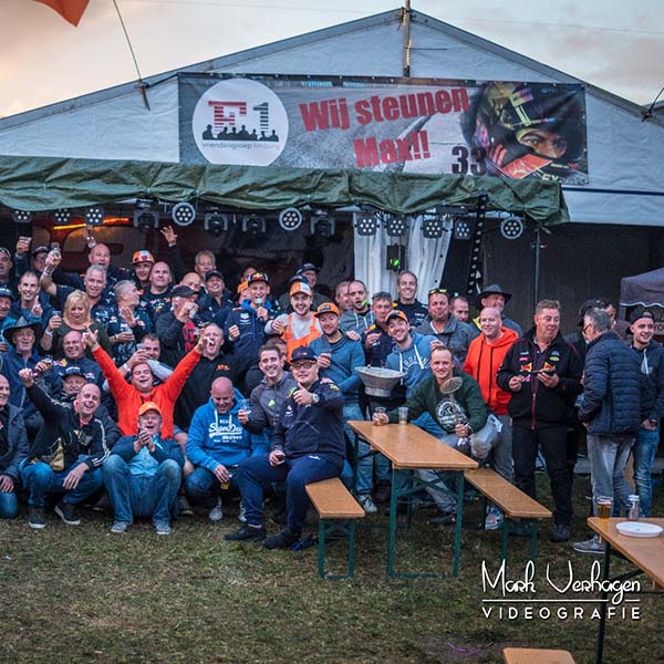 De vriendengroep wordt ieder jaar groter en professioneler en de feesten die zij organiseren op “hun camping” zijn inmiddels enorm populair onder de F1 bezoekers. Om gemakkelijk herkenbaar te zijn tussen alle andere kampeerders heb ik een spandoek ontworpen. Dit spandoek heeft een afmeting van 4 x 1 meter en heb ik laten drukken op PVC, door de metalen ringen is deze overal eenvoudig te bevestigen. Het spandoek heeft inmiddels een mooie prominente plek aan de voorkant van de tent gekregen en zorgt voor een stuk extra exposure.